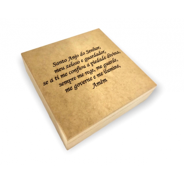 Oração do Santo Anjo gravada a laser na tampa da caixa
