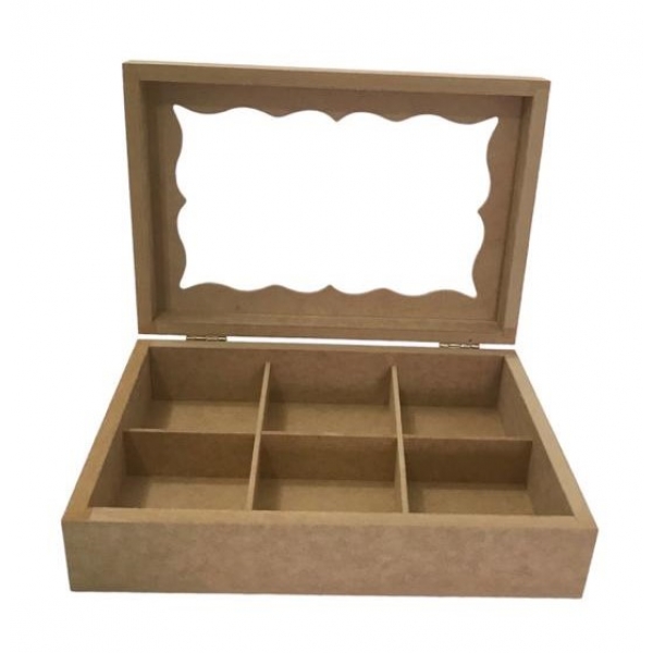 Caixa Porta Jóias Biju Chá c/6 Divisórias Tampa c/ Vidro MDF cru