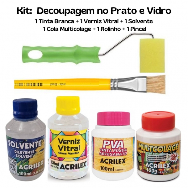 Informações do produto: Kit de Decoupagem p/ Vidro completo: 1 Tinta Branca +1 Multicolage +1 Verniz Vitral +1 Solvente +1 Rolinho +1 pincel